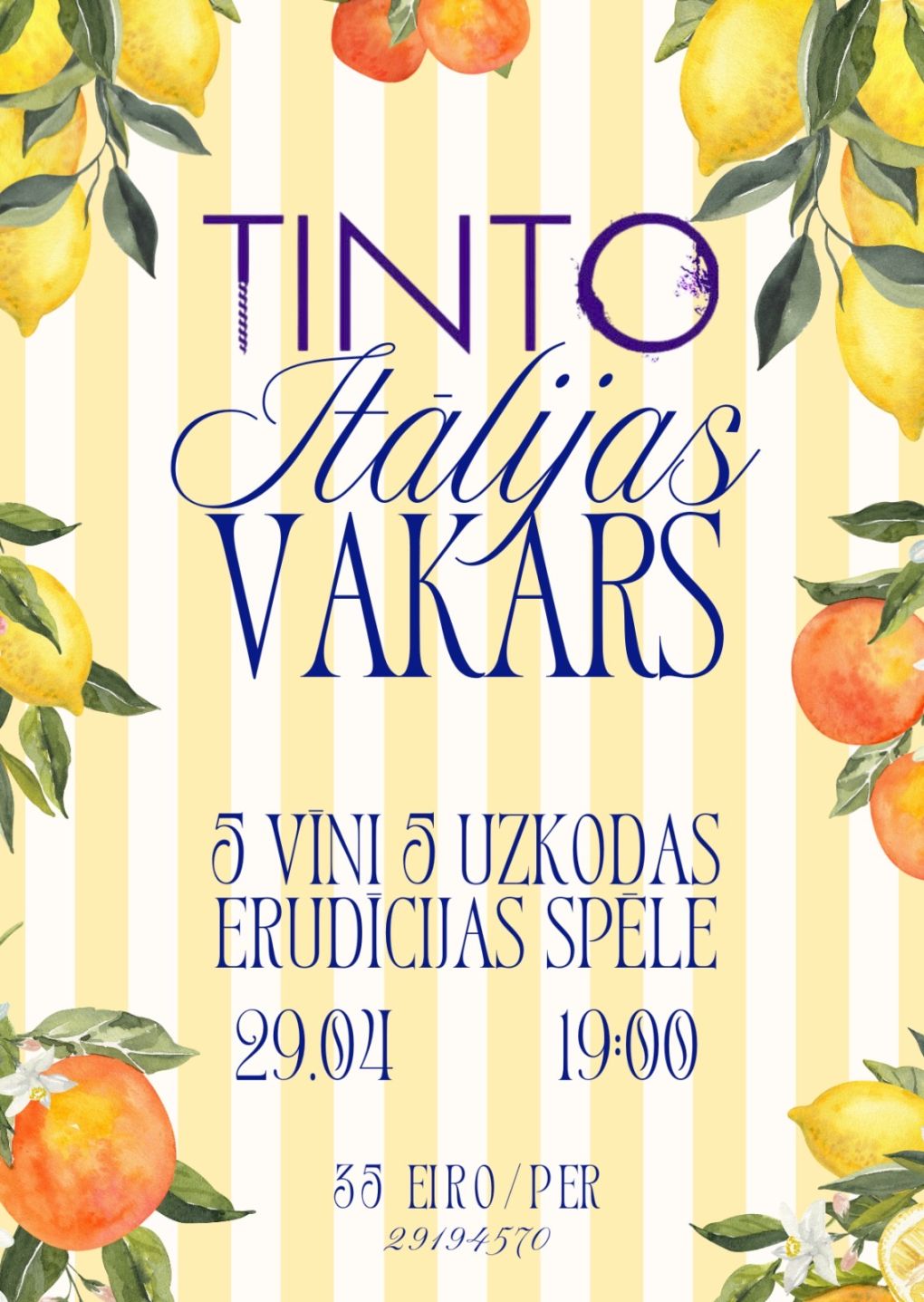 Pasākuma laikā baudīsim dažādus Itālijas vīnus, uzkodas un paralēli tam spēlēsim Quiz game ar vairāk kā 30 jautājumiem par Itālijas gastronomiju, kultūru, ģeogrāfiju un protams par vīnu!
