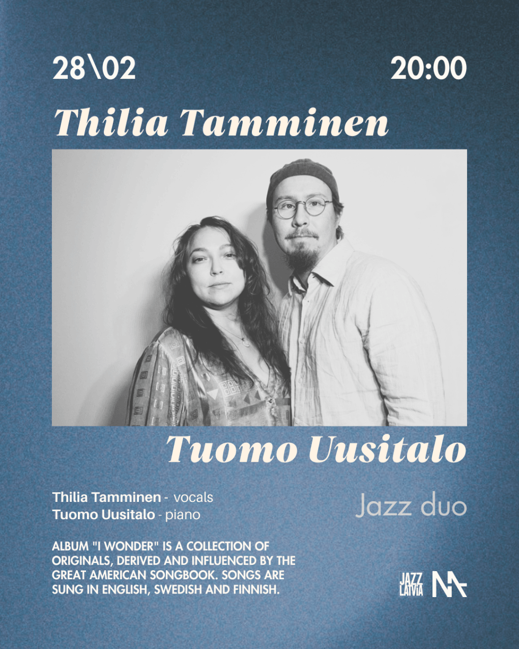 28 февраля джаз-клуб MASA принимает пианиста Туомо Ууситало и певицу Тилию Тамминен с их недавно выпущенным альбомом 'I Wonder' – коллекцией оригинальных композиций, вдохновленных Great American Songbook и исполненных на трёх языках: английском, шведском и финском.
